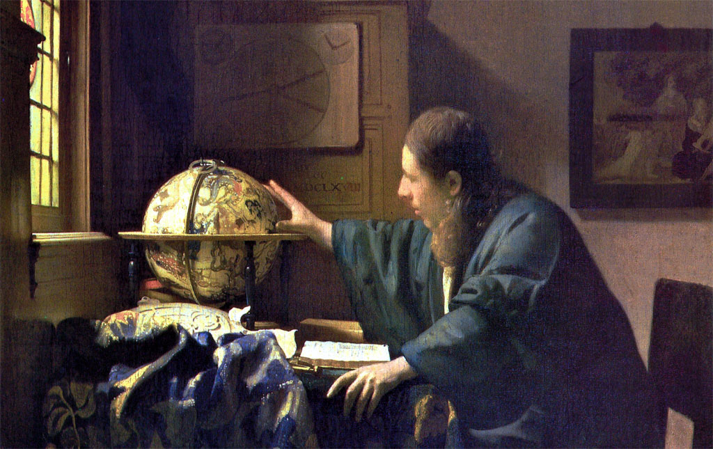 “Il dipinto intitolato “Astronomo” (1668) di Vermeer brilla, nell’oscura e ombrosa luce filtrata prima dagli alberi e poi dalle finestre, nelle sale del Louvre dedicate alla pittura fiamminga, olandese e tedesca, inondando l’anima dello spettatore con la limpida luce di un soleggiato giorno del 1668 e di quello spasmodico interesse che rendeva eccitante gli aspetti di una scienza ancora immatura”….